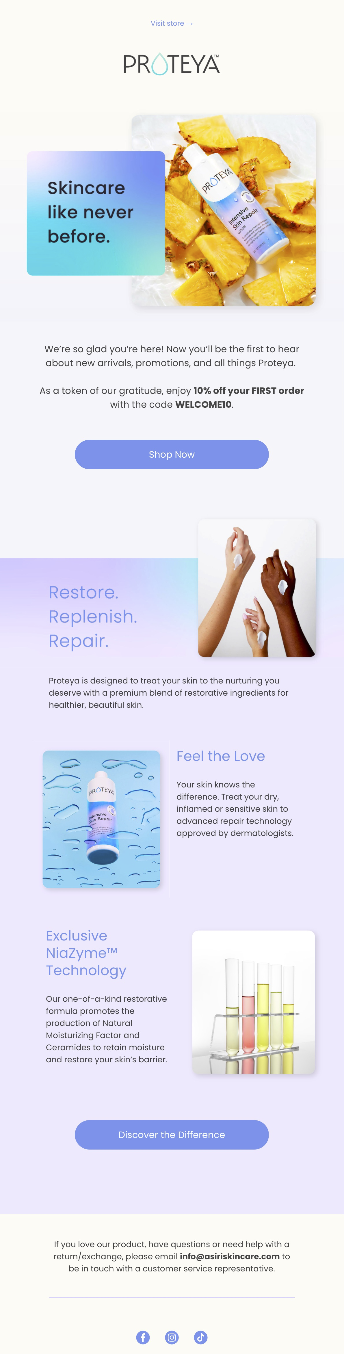 Advertise Proteya’s patented skincare products through enticing copy on various selling platforms, social media platforms, and email campaigns.